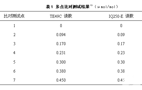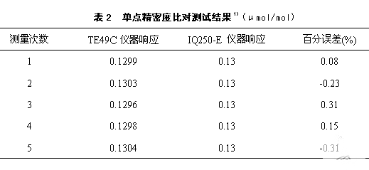 1)被比对仪器(IQ250-E)校准曲线的截距a=- 1.6×10-3μmol/mol,斜率b=1.004, 相关系数r=0.9999。