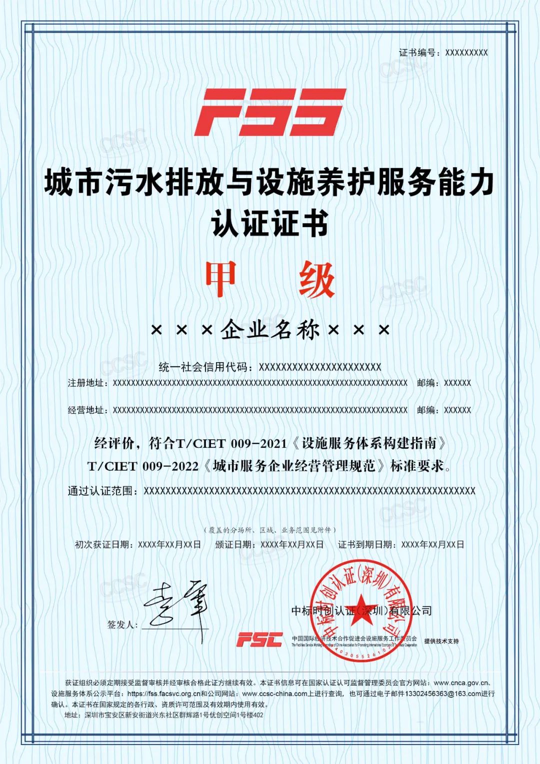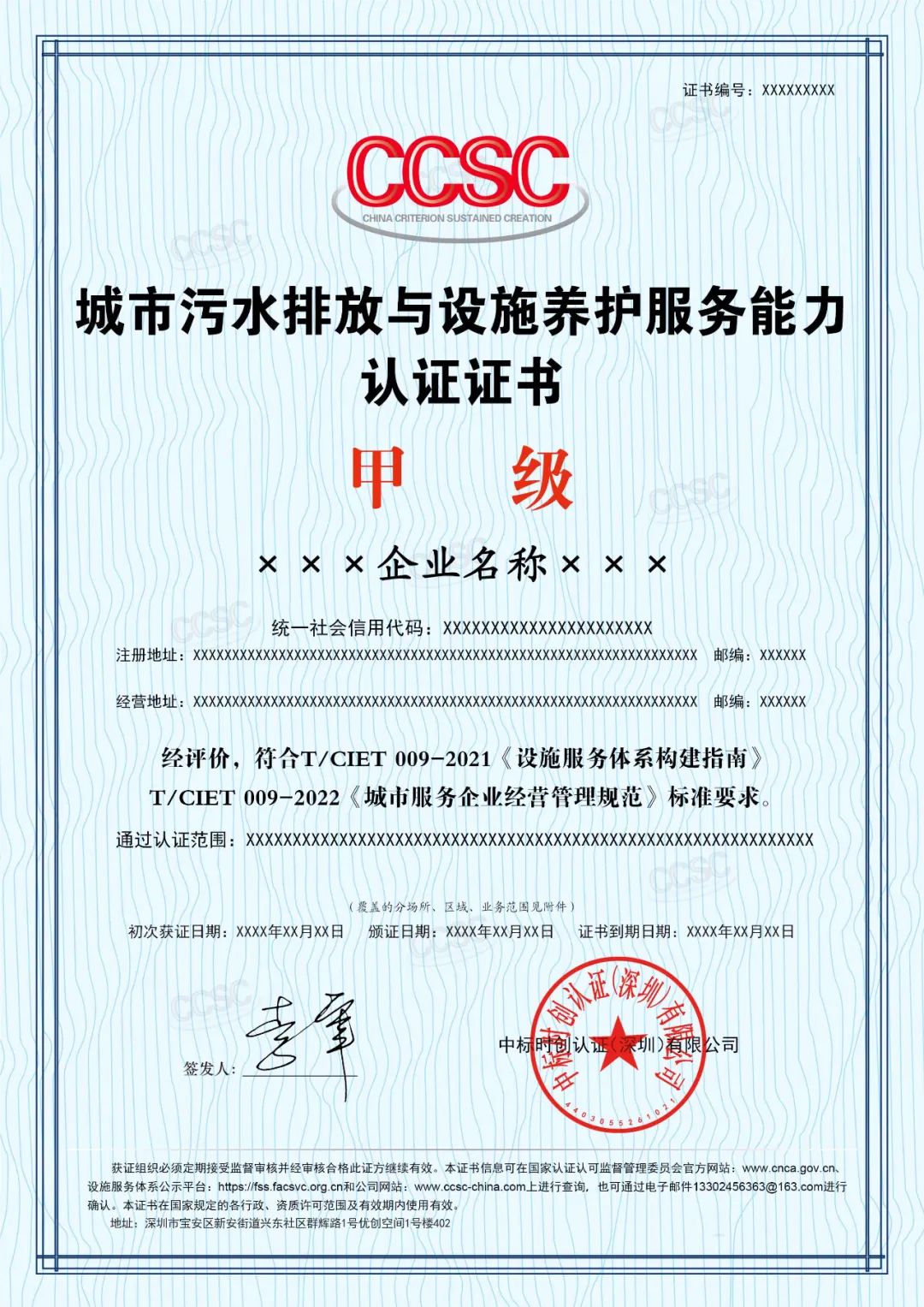 由中标时创认证(深圳)有限公司颁发的《城市污水排放与设施养护服务能力认证证书》表明企业运营服务符合T/CIET 009-2022《城市服务企业经营管理规范》T/CIET/009-2021《设施服务体系构建指南》,严格按照国家认证相关规定与要求,在前期完成认证申请评审和相关文件审核的基础上,派遣审查组进行现场审查,符合认证标准要求,推荐认证。