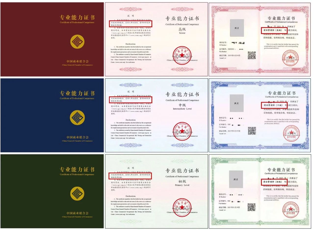 由中国商业联合会颁发的清洁管理师,分为初级、中级和高级三个级别,并可在中国商业联合会授权的培训平台咨信课堂在线学习。线上报名,随到随学,完成规定课时,考试合格后将获得对应等级的“清洁管理师”职业能力培训证书,持证上岗,全国通用。证书信息可在中国商业联合会官网及行业官网(www.chinaclean.org)查询。