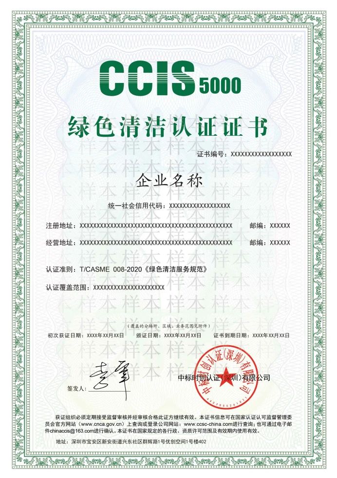 CCIS5000绿色清洁认证是由国家认监委批准的具有专业能力的第三方认证机构中标时创认证(深圳)有限公司对企业的绿色清洁服务能力进行评价。企业符合绿色清洁认证标准要求,被推荐认证后,可获得由时创认证(深圳)有限公司颁发的绿色清洁认证证书,证书信息可在国家认证认可监督管理委员会官方网站(www.cnca.gov.cn)、行业官网 (www.chinaclean.org)上查询,全国通用,含金量高。