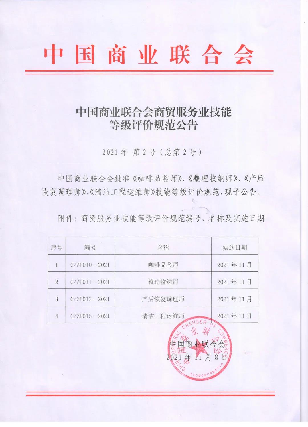 中国商业联合会发布2021年度第二批商贸服务业行业技能评价规范:《咖啡品鉴师》、《整理收纳师》、《产后修复调理师》、《清洁工程运维师》。
