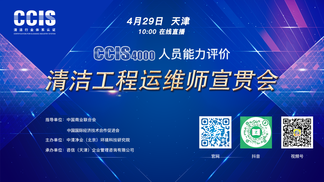 4月29日上午10点整,将在线上开展“CCIS4000人员能力评价暨清洁工程运维师宣贯会”,本次宣贯会实际上是属于“清洁工程运维师”的第一次“发布会”。中清净业(北京)环境科技研究院为“清洁工程运维师”岗位标准的起草单位,因此标准第一起草人李军院长解读清洁工程运维师绝对是本次宣贯会最大的亮点之一,清洁工程运维师的设置背景是怎样的?其与CCIS体系有何联系?清洁工程运维师又与行业可持续发展的人才体系关系如何?……4月29日上午10点,“CCIS4000人员能力评价暨清洁工程运维师宣贯会”不见不散!