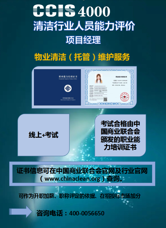 由中国商业联合会颁发的物业清洁(托管)维护服务项目经理证书,并可在中国商业联合会授权的培训平台咨信课堂在线学习。线上报名,随到随学,完成规定课时,考试合格后即可获得证书。持证上岗,全国通用。