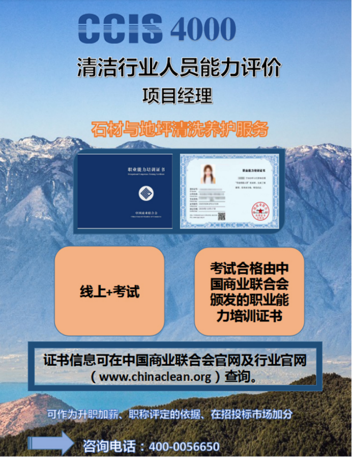 由中国商业联合会颁发的石材与地坪清洗养护服务项目经理证书,并可在中国商业联合会授权的培训平台咨信课堂在线学习。线上报名,随到随学,完成规定课时,考试合格后即可获得证书。持证上岗,全国通用。