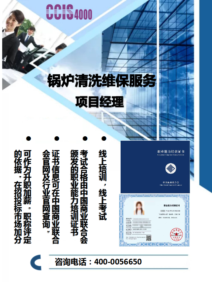 CCIS4000锅炉清洗维保服务项目经理证书课程已经上线,从各专业项目的定义、作用、技术、设备,解决方案,未来发展走向等方面设置课程,提高学员的专业能力、工作质量,拓展视野,增加竞争优势。学员线上报名,完成规定课时。线上考试,考试合格后,获得由中国商业联合会颁发的职业能力培训证书可在中国商业联合会官网及行业官网(www.chinaclean.org)查询,全国通用!欢迎报名!