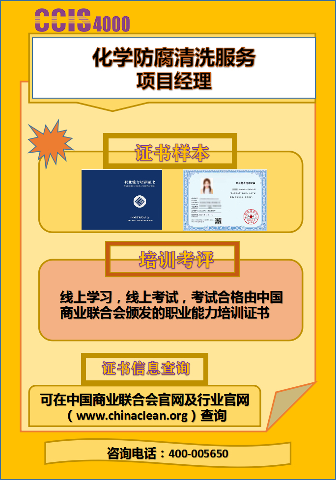 CCIS4000化学防腐清洗服务项目经理证书课程已经上线,从各专业项目的定义、作用、技术、设备,解决方案,未来发展走向等方面设置课程,提高学员的专业能力、工作质量,拓展视野,增加竞争优势。学员线上报名,完成规定课时。线上考试,考试合格后,获得由中国商业联合会颁发的职业能力培训证书可在中国商业联合会官网及行业官网(www.chinaclean.org)查询,全国通用!欢迎报名!