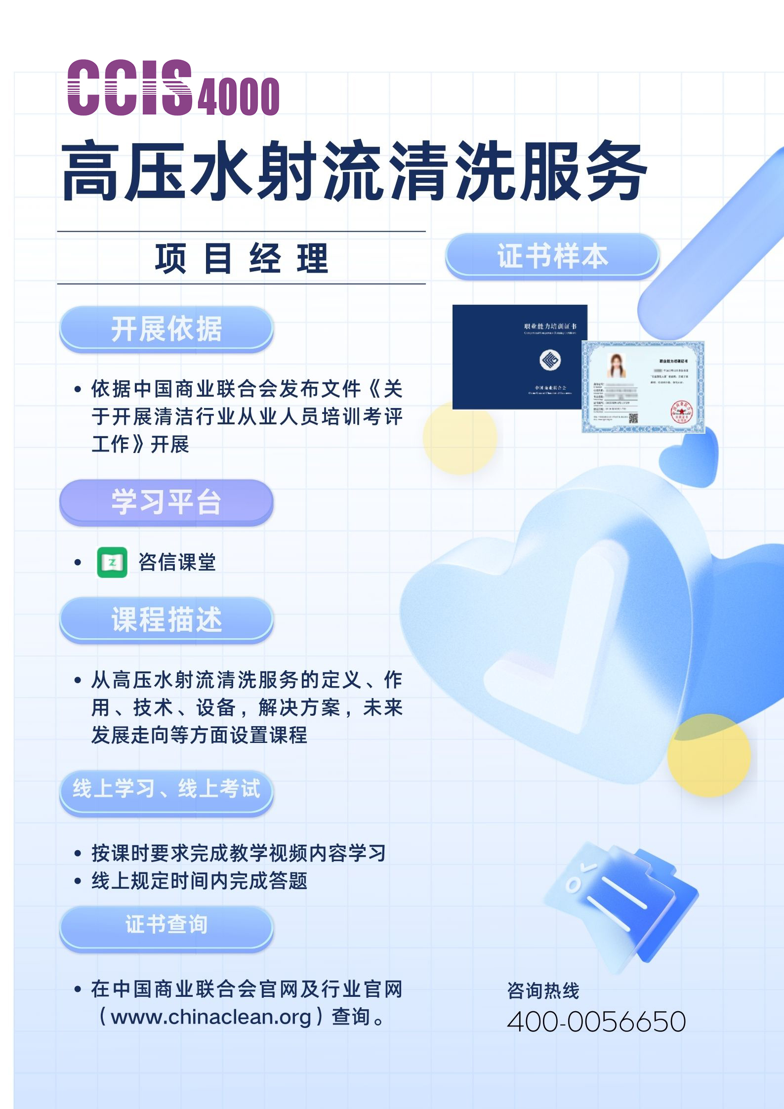 CCIS4000高压水射流清洗服务项目经理证书课程已经上线,从各专业项目的定义、作用、技术、设备,解决方案,未来发展走向等方面设置课程,提高学员的专业能力、工作质量,拓展视野,增加竞争优势。学员线上报名,完成规定课时。线上考试,考试合格后,获得由中国商业联合会颁发的职业能力培训证书可在中国商业联合会官网及行业官网(www.chinaclean.org)查询,全国通用!欢迎报名!