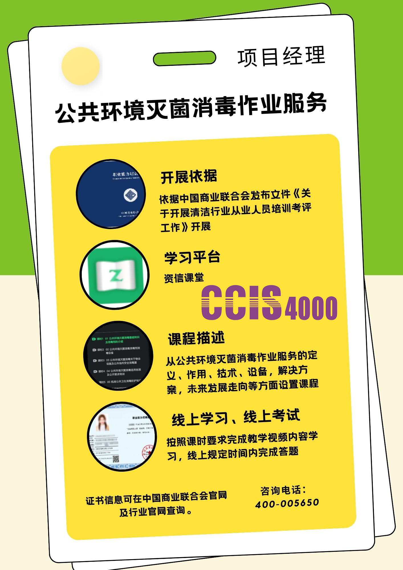 CCIS4000公共环境灭菌消毒作业服务项目经理证书课程已经上线,从各专业项目的定义、作用、技术、设备,解决方案,未来发展走向等方面设置课程,提高学员的专业能力、工作质量,拓展视野,增加竞争优势。学员线上报名,完成规定课时。线上考试,考试合格后,获得由中国商业联合会颁发的职业能力培训证书可在中国商业联合会官网及行业官网(www.chinaclean.org)查询,全国通用!欢迎报名!