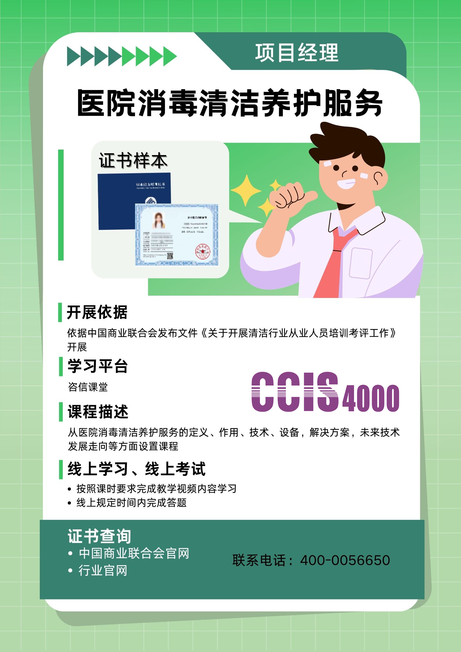CCIS4000医院消毒清洁养护服务项目经理证书课程已经上线,从各专业项目的定义、作用、技术、设备,解决方案,未来发展走向等方面设置课程,提高学员的专业能力、工作质量,拓展视野,增加竞争优势。学员线上报名,完成规定课时。线上考试,考试合格后,获得由中国商业联合会颁发的职业能力培训证书可在中国商业联合会官网及行业官网(www.chinaclean.org)查询,全国通用!欢迎报名!