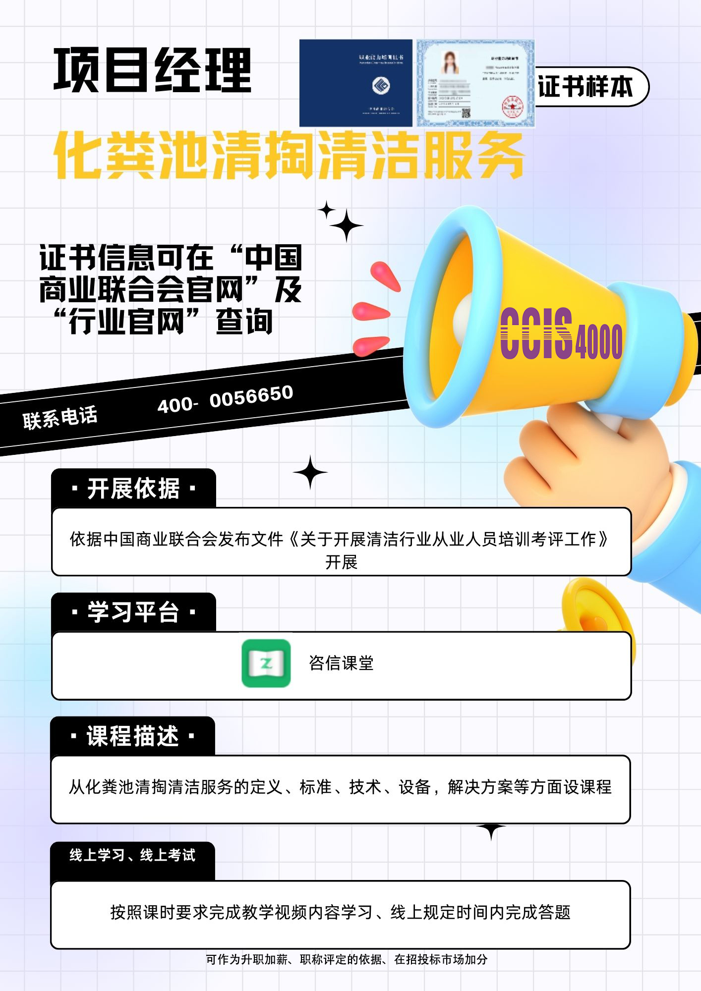 CCIS4000化粪池清掏清洁服务项目经理证书课程已经上线,从各专业项目的定义、标准、技术、设备,解决方案等方面设置课程,提高学员的专业能力、工作质量,拓展视野,增加竞争优势。学员线上报名,完成规定课时。线上考试,考试合格后,获得由中国商业联合会颁发的职业能力培训证书可在中国商业联合会官网及行业官网(www.chinaclean.org)查询,全国通用!欢迎报名!