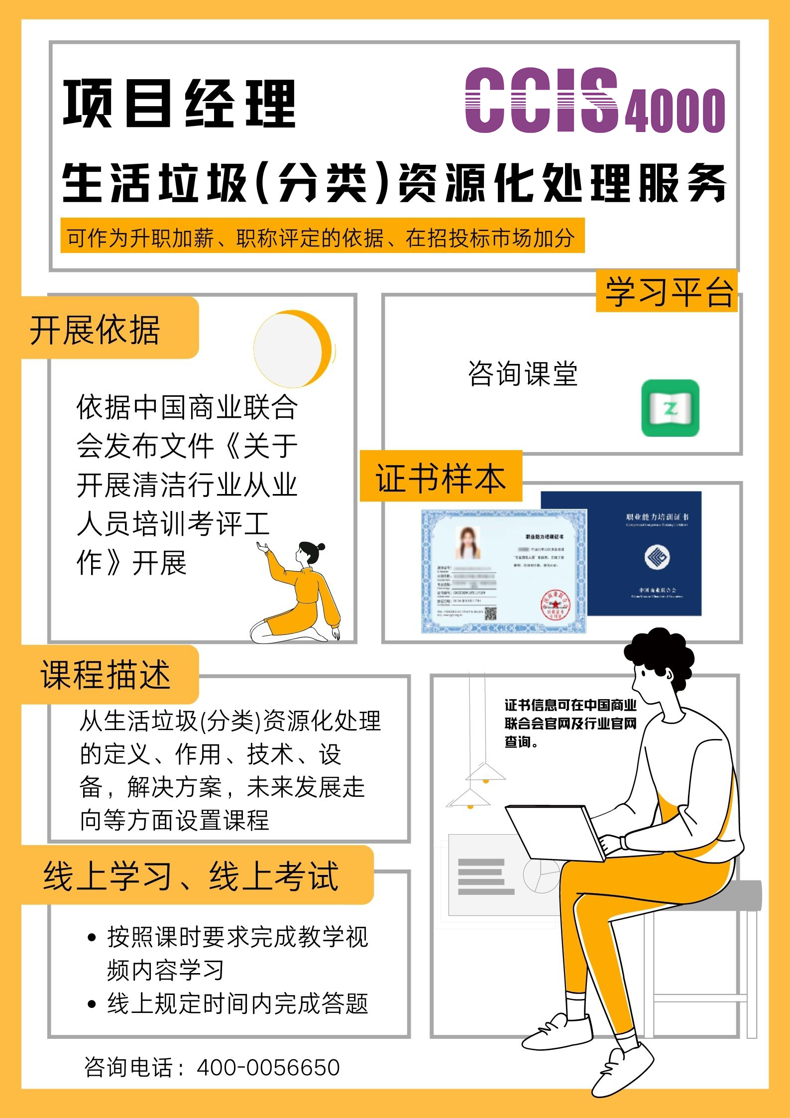 CCIS4000生活垃圾(分类)资源化处理服务项目经理证书分三个类别,包括信息化管理员、项目运维经理、垃圾资源化管理师,从各个专业项目的定义、标准、意义,最新技术、设备,解决方案等方面设置课程,提高学员的专业能力、工作质量,拓展视野,增加竞争优势。学员线上报名,完成规定课时。线上考试,考试合格后,获得由中国商业联合会颁发的职业能力培训证书可在中国商业联合会官网及行业官网(www.chinaclean.org)查询,全国通用!欢迎报名!