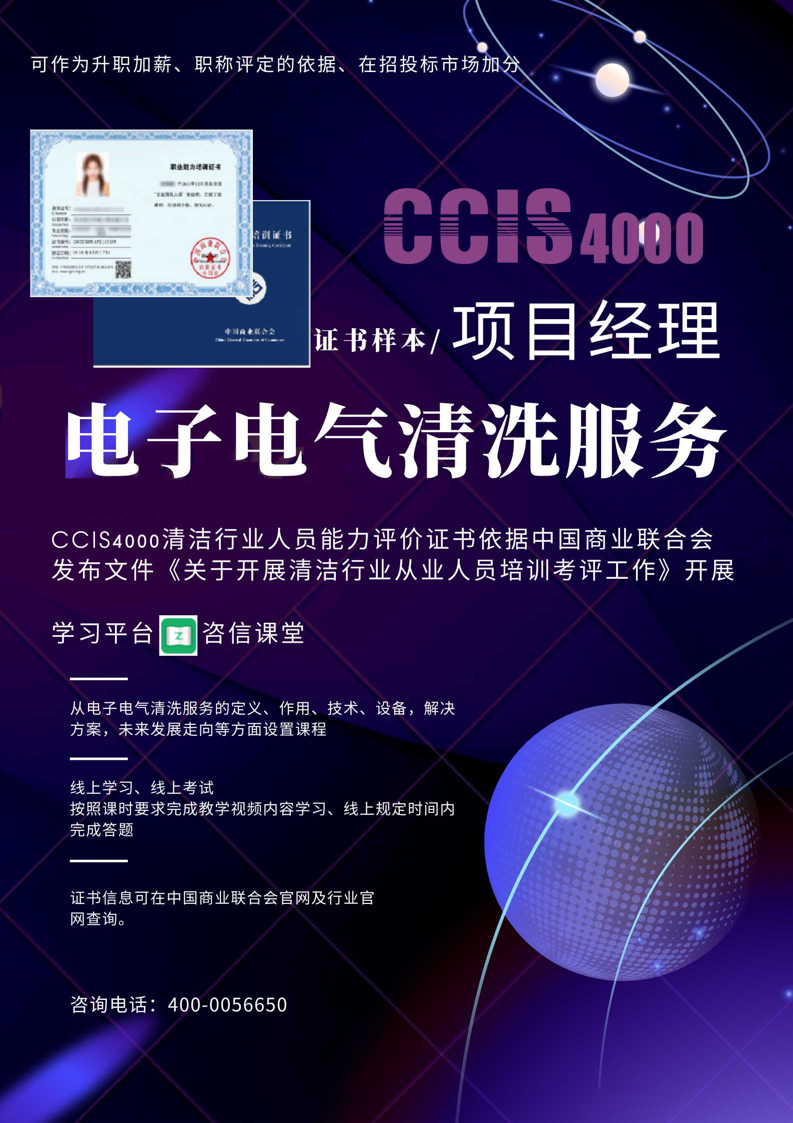 CCIS4000电子电气清洗服务项目经理课程已开课,从项目的定义、标准、意义,最新技术、设备,解决方案等方面设置课程,提高学员的专业能力、工作质量,拓展视野,增加竞争优势。学员线上报名,完成规定课时。线上考试,考试合格后,获得由中国商业联合会颁发的职业能力培训证书可在中国商业联合会官网及行业官网(www.chinaclean.org)查询,全国通用!欢迎报名!