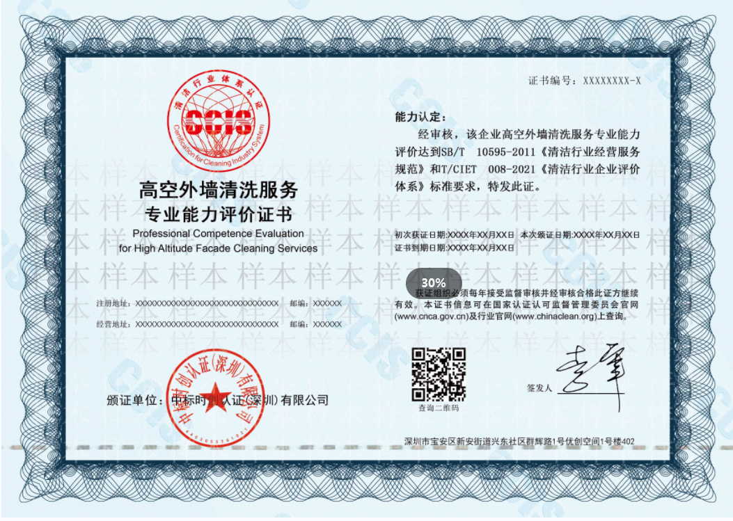 中标时创认证(深圳)有限公司颁发,国家认证认可监督管理委员会监管的CCIS1000清洁行业专业能力评价认证 “高空外墙清洗服务专业能力评价”认证证书所依据的标准是商务部颁布行业标准的《清洁行业经营服务规范》(SB/T10595-2011)。以及由中国国际经济技术合作促进会归口的团体标准《清洁行业企业评价体系》(T/CIET 008-2021)。严格按照国家认证相关规定与要求,在前期完成认证申请评审和相关文件审核的基础上,派遣审查组进行现场审核,符合认证标准要求,推荐认证。