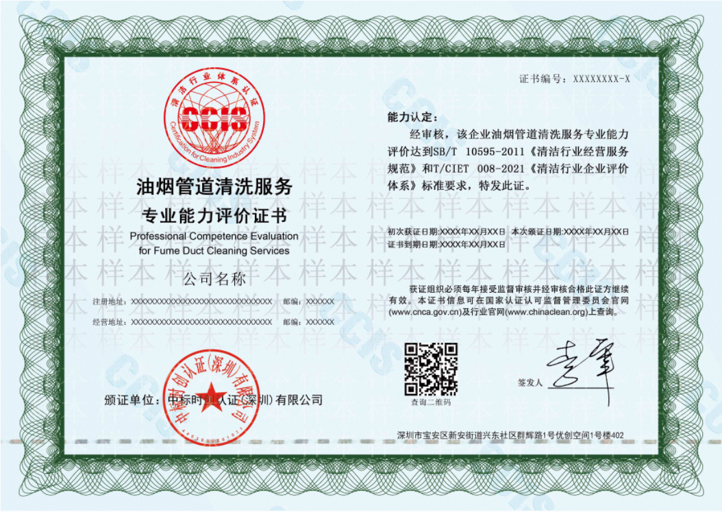 由中标时创认证(深圳)有限公司颁发的CCIS清洁环卫环境行业体系认证“油烟管道清洗服务专业能力评价”认证证书是依据商务部行业标准《清洁行业经营服务规范》(SB/T10595-2011)和国促会团体标准《清洁行业企业评价体系》(T/CIET 008-2021),按照国家认证相关规定与要求对企业的认证申请确定审核的可行性、文件评审、编制审核计划、审核组工作的分配和准备审核工作文件,然后进行现场审核,认证复核和认证决定后推荐认证。