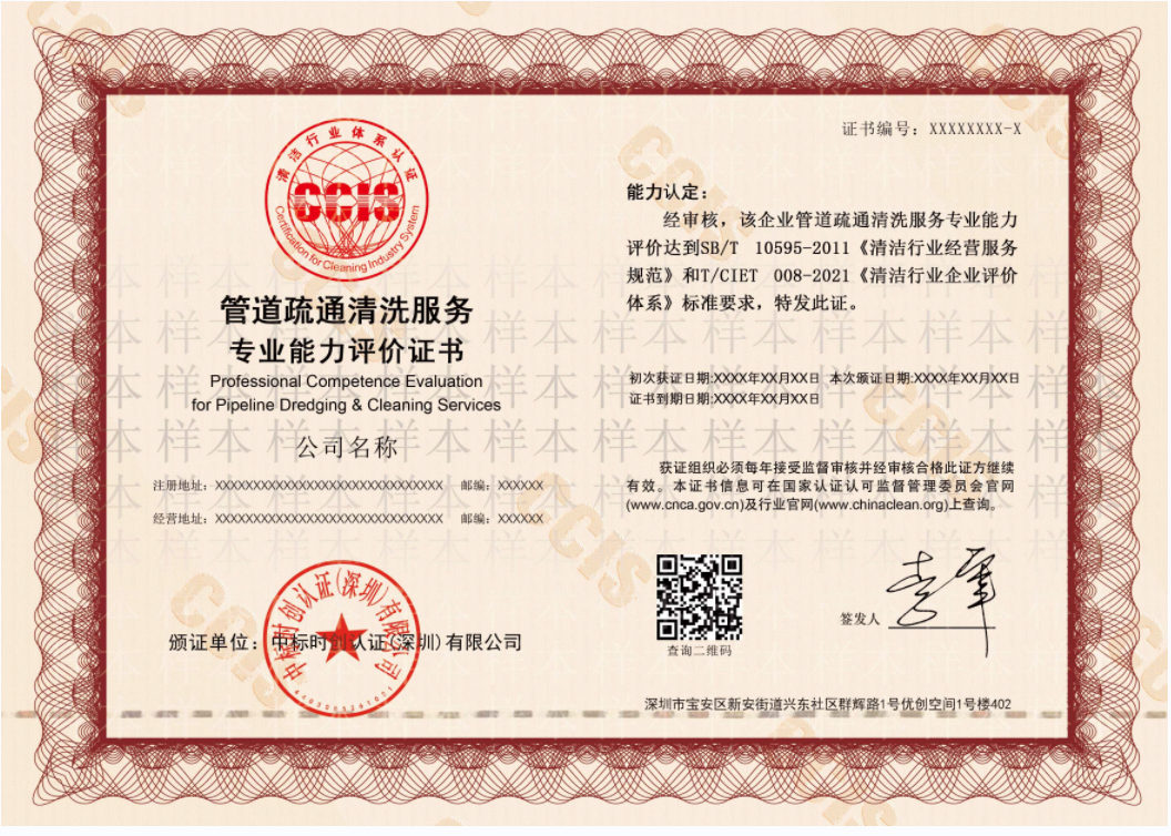 中标时创认证(深圳)有限公司颁发,国家认证认可监督管理委员会监管的CCIS1000清洁行业专业能力评价认证 “锅炉清洗维保服务专业能力评价”认证证书所依据的标准是商务部颁布行业标准的《清洁行业经营服务规范》(SB/T10595-2011)。以及由中国国际经济技术合作促进会归口的团体标准《清洁行业企业评价体系》(T/CIET 008-2021)。严格按照国家认证相关规定与要求,在前期完成认证申请评审和相关文件审核的基础上,派遣审查组进行现场审核,符合认证标准要求,推荐认证。