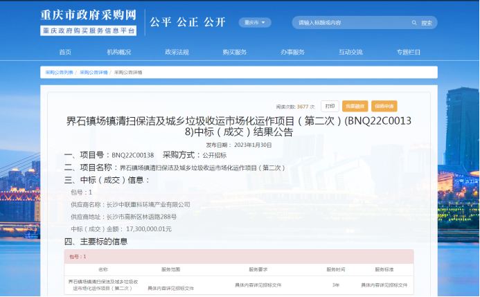 重庆市政府采购网显示,1月30日,界石镇场镇清扫保洁及城乡垃圾收运市场化运作项目公布中标结果,成交信息如下: