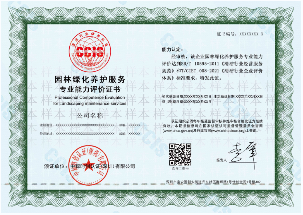 由中标时创认证(深圳)有限公司颁发的CCIS清洁环卫环境行业体系认证“园林绿化养护服务专业能力评价”认证证书是依据商务部行业标准《清洁行业经营服务规范》(SB/T10595-2011)和国促会团体标准《清洁行业企业评价体系》(T/CIET 008-2021),严格按照国家认证相关规定与要求,在前期完成认证申请评审和相关文件审核的基础上,派遣审查组进行现场审查,符合认证标准要求,推荐认证。