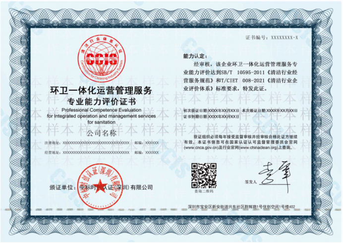由中标时创认证(深圳)有限公司颁发的CCIS清洁环卫环境行业体系认证中的CCIS1000清洁环卫环境行业服务专业能力评价“环卫一体化运营管理服务专业能力评价”认证证书是依据商务部行业标准《清洁行业经营服务规范》(SB/T10595-2011)和国促会团体标准《清洁行业企业评价体系》(T/CIET 008-2021),对企业具备专项服务能力的评价。