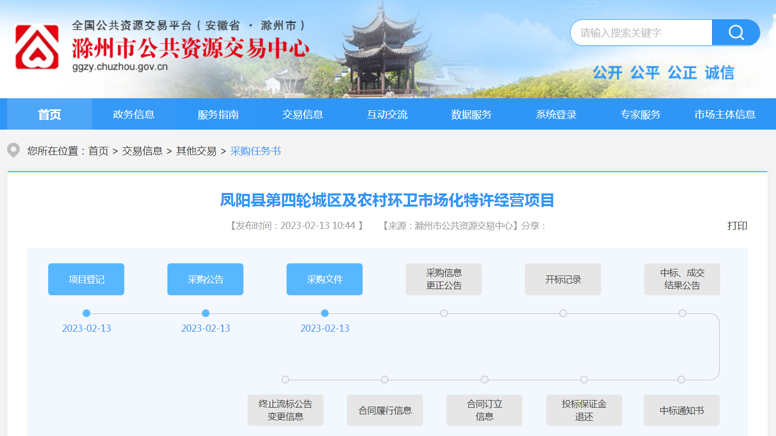 2月13日,据滁州市公共资源交易中心官网公示信息显示,安徽省滁州市凤阳县第四轮城区及农村环卫市场化特许经营项目公开招标,预算总额134183.5136万元,本项目采用不见面开标(远程解密)方式。合同履行期限为8年,实行3+3+2共3个服务期的方式,本项目不接受联合体投标,预计3月6日开标。