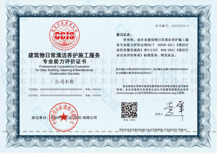 由中标时创认证(深圳)有限公司颁发的CCIS清洁环卫环境行业体系认证“建筑物日常清洁养护施工服务专业能力评价”认证证书是依据商务部行业标准《清洁行业经营服务规范》(SB/T10595-2011)和国促会团体标准《清洁行业企业评价体系》(T/CIET 008-2021),严格按照国家认证相关规定与要求,在前期完成认证申请评审和相关文件审核的基础上,派遣审查组进行现场审查,符合认证标准要求,推荐认证。