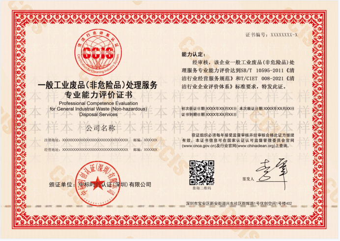 由认监委认可的第三方认证机构中标时创认证(深圳)有限公司颁发的CCIS1000清洁行业专业能力评价认证“一般工业废品(非危险品)处理服务专业能力评价”认证证书是依据商务部行业标准《清洁行业经营服务规范》(SB/T10595-2011)和国促会团体标准《清洁行业企业评价体系》(T/CIET 008-2021)严格按照国家认证相关规定与要求,在前期完成认证申请评审和相关文件审核的基础上,派遣审查组进行现场审查,符合认证标准要求,推荐认证。