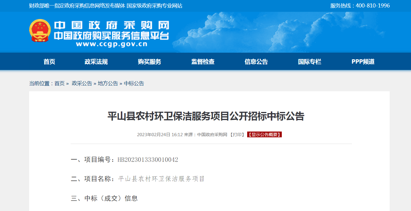 据中国政府采购网显示,2月24日,平山县农村环卫保洁服务项目公开招标结果,成交详细信息如下: