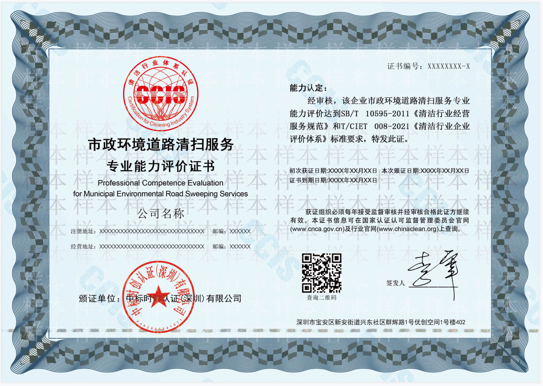 由中标时创认证(深圳)有限公司颁发的CCIS1000清洁行业专业能力评价“市政环境道路清扫服务专业能力评价”认证证书是依据商务部行业标准《清洁行业经营服务规范》(SB/T10595-2011)和国促会团体标准《清洁行业企业评价体系》(T/CIET 008-2021),对企业具备专项服务能力的评价。