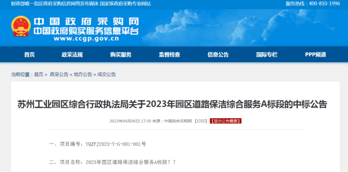 据中国政府采购网显示,4月6日,江苏省苏州工业园区综合行政执法局2023年园区道路保洁综合服务项目公布中标结果,项目分为9个标段,项目成交总额63268.853762万元,服务期3年。除B标段外,其余8个标段均为联合体中标。
