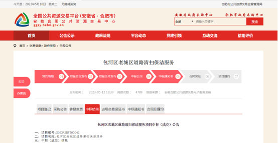 据全国公共资源交易平台(安徽省·合肥市)网显示,5月12日,安徽省合肥市包河区老城区道路清扫保洁服务项目公开中标结果,详细信息如下: