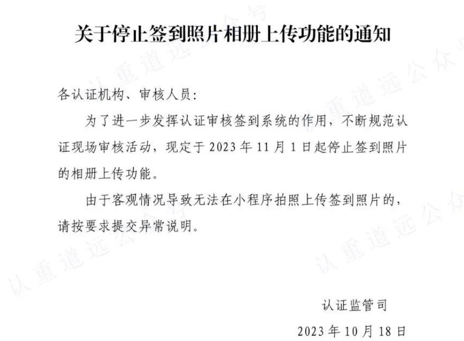 近日,国家市场总局认证监管小程序“认证到”发布通知:为进一步发挥认证审核签到系统的作用,将于2023年11月1日起停止签到照片的相册上传功能。