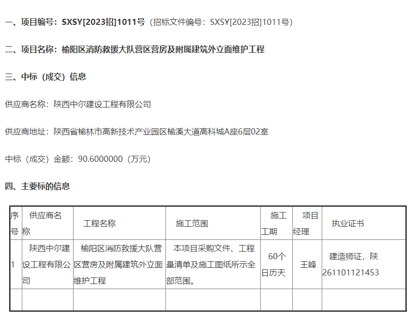 近日,中国政府采购网发布中标公告,榆阳区消防救援大队营区营房及附属建筑外立面维护工程成交公告。