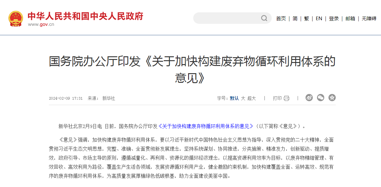 新华社北京2月9日电 日前,国务院办公厅印发《关于加快构建废弃物循环利用体系的意见》(以下简称《意见》)。