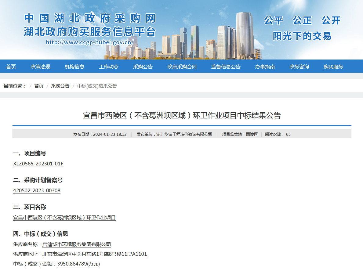 湖北省政府采购网消息,1月23日,宜昌市西陵区(不含葛洲坝区域)环卫作业项目公布开标结果,启迪环境收获2024年度首个环卫“亿元标”。中标情况如下: