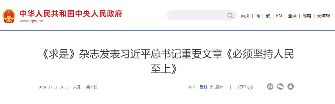 新华社北京3月31日电 4月1日出版的第7期《求是》杂志将发表中共中央总书记、国家主席、中央军委主席习近平的重要文章《必须坚持人民至上》。这是习近平总书记2012年11月至2023年12月期间有关重要论述的节录。