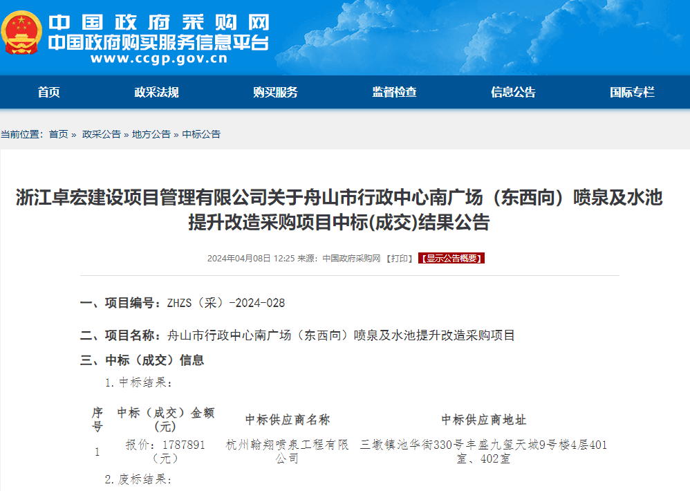 近日,中国政府采购网发布中标公告,浙江卓宏建设项目管理有限公司关于舟山市行政中心南广场(东西向)喷泉及水池提升改造采购项目中标(成交)结果公告。